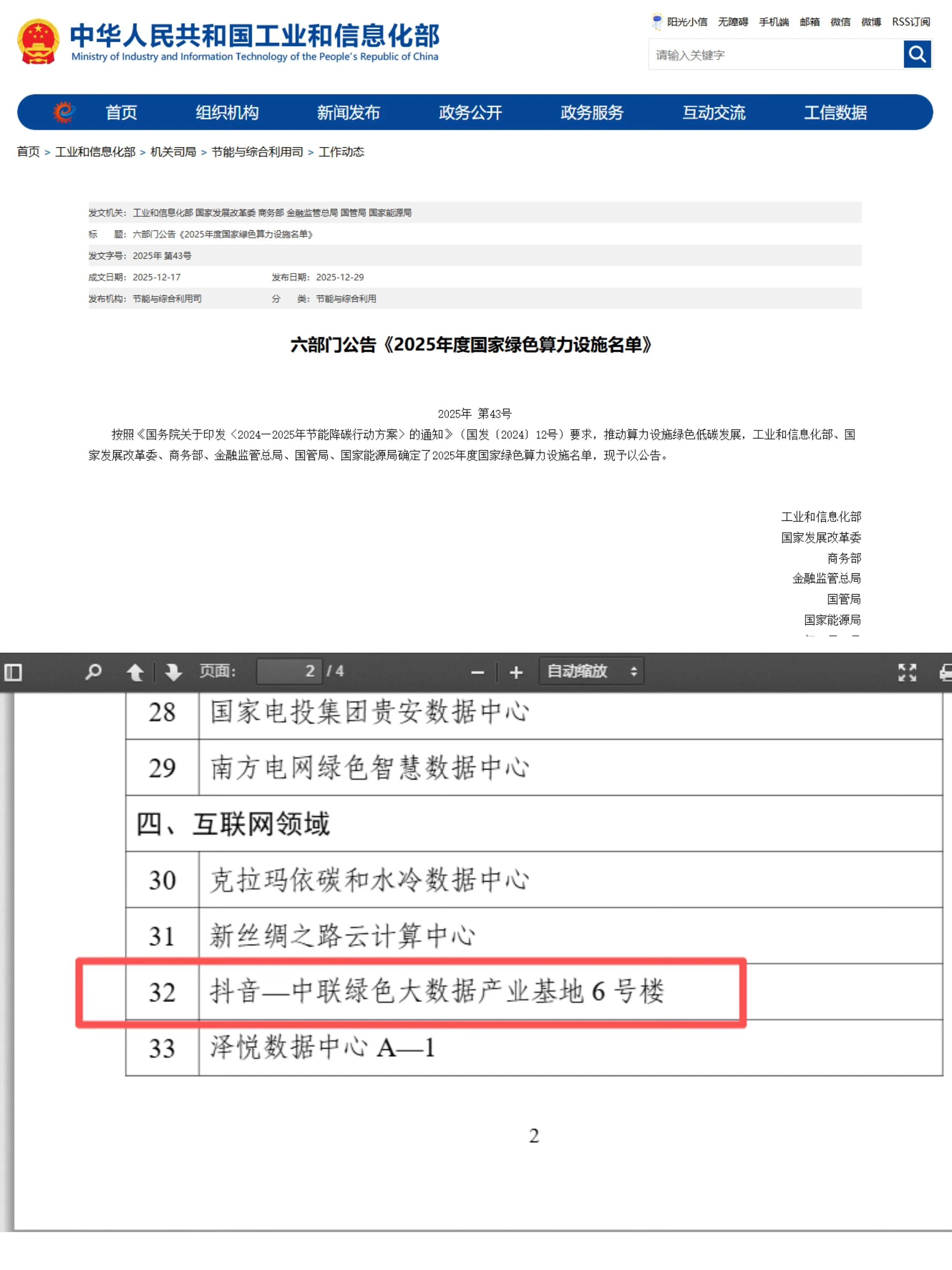 12月29日,工业和信息化部、国家发展改革委、商务部、金融监管总局、国管局、国家能源局联合发布了《2025年度国家绿色算力设施名单》。中联绿色大数据产业基地6号楼成功入选,这也是中联数据集团第三次荣登榜上。